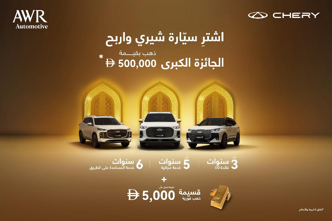 ومن وحي ديمومة الذهب ورمزيته الخالدة عبر الزمن، تحوّل الحملة كل عملية شراء لسيارة شيري خلال شهر رمضان إلى تجربة قيّمة تنسجم مع قيم الشهر الفضيل. حيث سيحصل العملاء الذين يشترون أي من طرازات شيري خلال فترة الحملة على قسيمة ذهب فوريّة مضمونة بقيمة تصل إلى 5,000 درهم إماراتي، مما يؤكد التزام شيري بتقديم مكافآت ملموسة يتجاوز أثرها حدود صالة العرض.